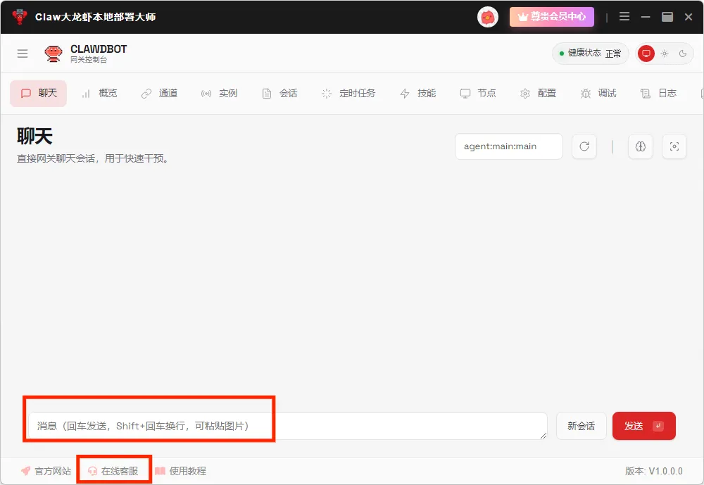 功能栏包含聊天、概览、通道等选项,当前在聊天页,可输入消息发起对话,底部还有在线客服入口,会有专业的技术人员为您答疑解惑。