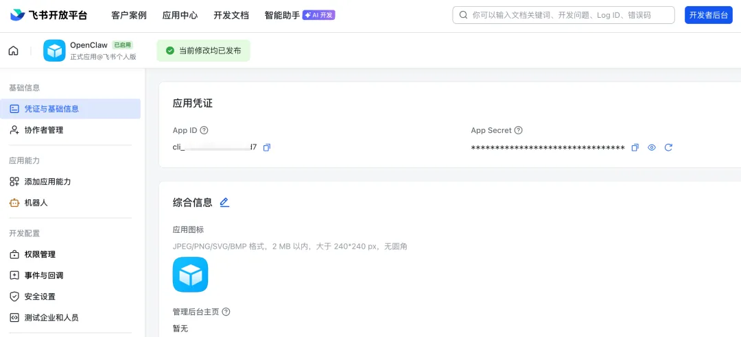 App ID(格式如「cli_xxxxxxxxx」); App Secret(重要!不要随意分享,避免泄露)