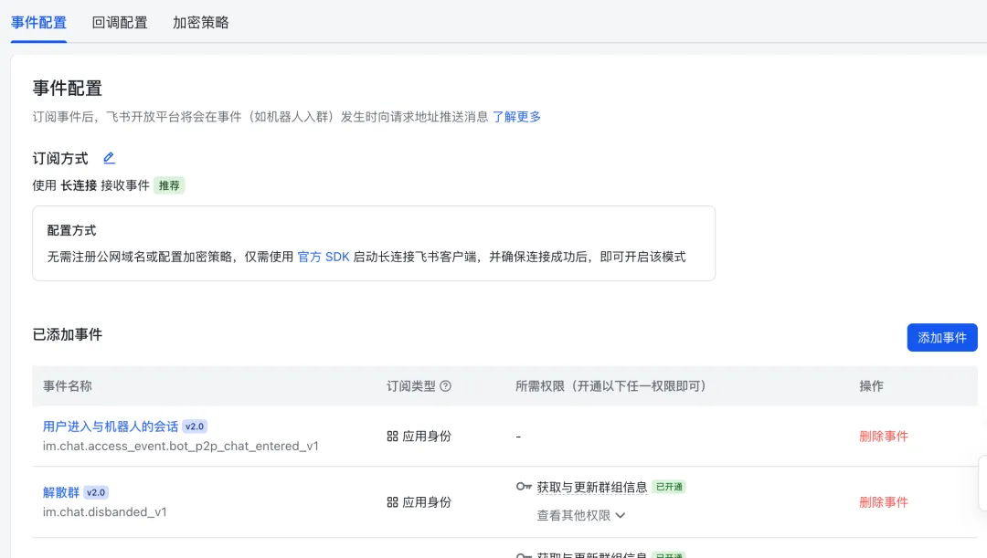 左侧菜单进入「事件与回调」→「事件配置」 请求方式选择「使用长连接接收事件」(长连接模式是首选:不需要公网 IP、不需要域名、不需要云服务器,个人电脑或 NAS 即可运行) 添加事件:搜索「im.message.receive_v1」(接收消息),勾选添加即可。这个是必须的事件,其他事件可以按需添加