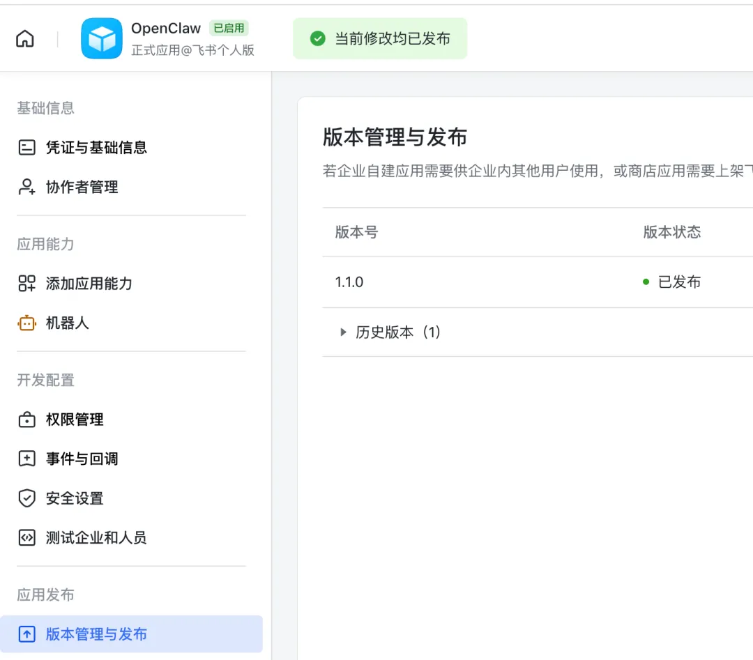 左侧菜单进入「版本管理与发布」,点击「创建版本」; 填写简单的版本说明(如“第一个龙虾AI上线”),提交发布; 等待审批(一般会很快自动通过,通常耗时几秒到几分钟)