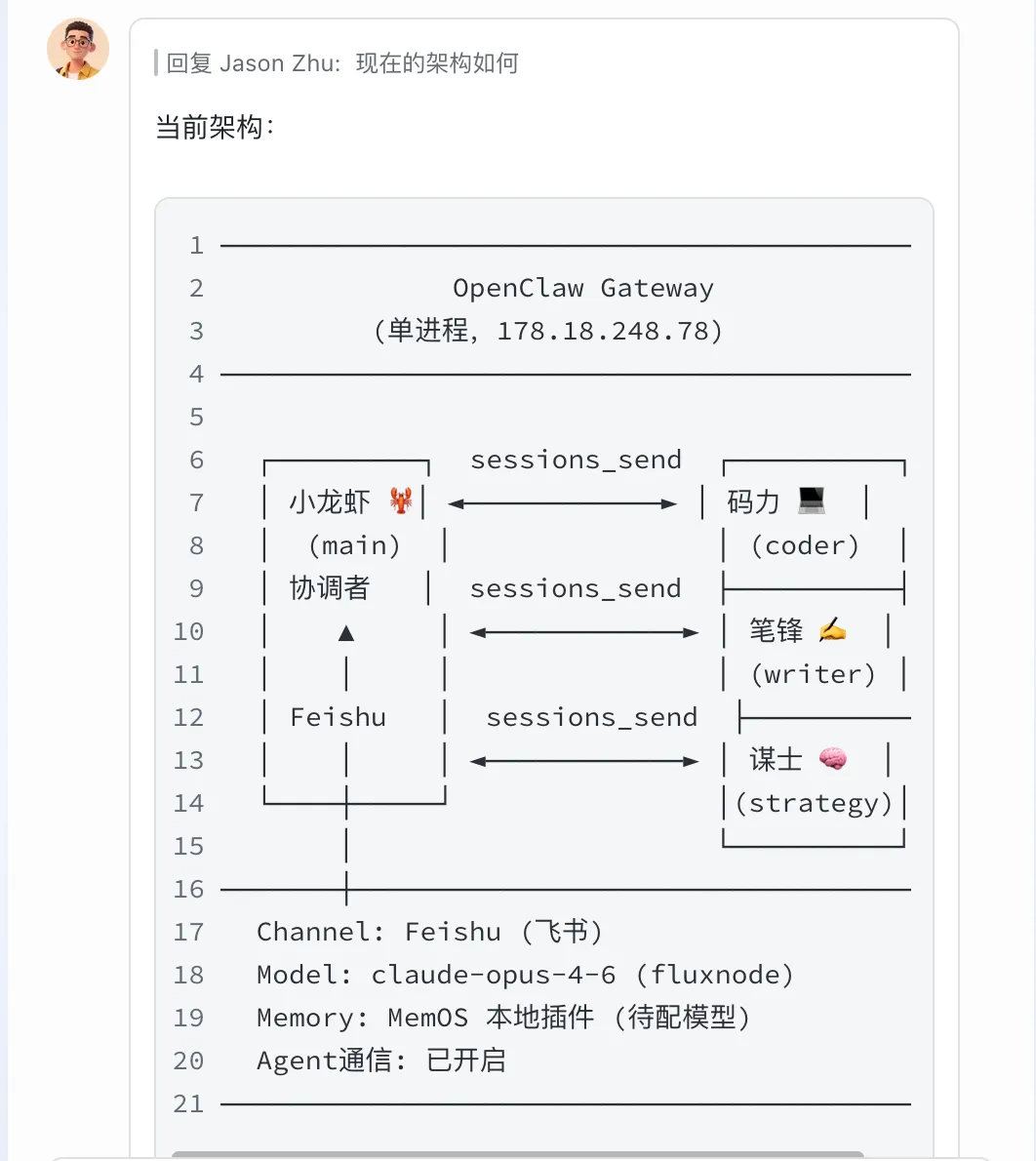 流程就是:我(飞书)→ 小龙虾 🦞 → 笔锋 ✏️ / 谋士 🧠 / 码力 💻