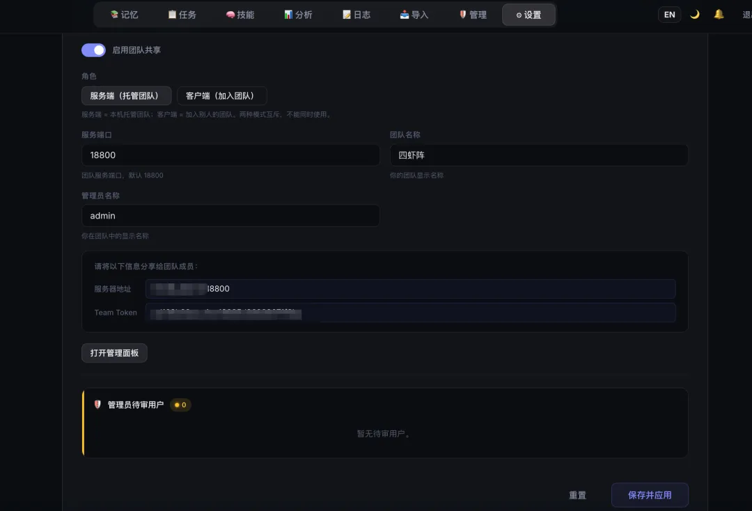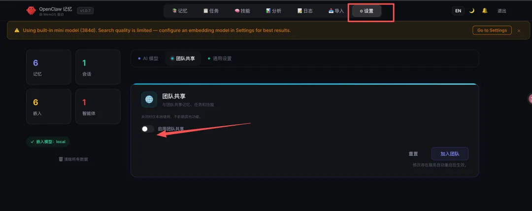 在记忆面板的设置功能下打开团队共享就行