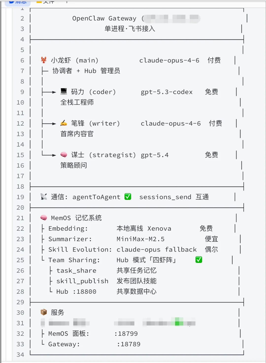 🦞 小龙虾(main)用 claude-opus-4-6,负责协调调度,接飞书消息,拆任务分发。贵的模型给最需要判断力的环节
