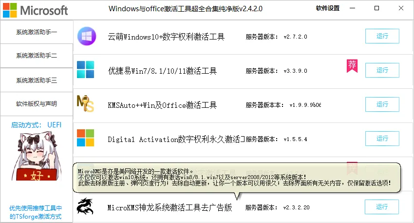 一款win系统激活工具整合包,确实比较强,收录的也都是最新可用的win和office激活软件,免费使用,无广告,而且界面简洁,一键安装,然后点击对应的软件,激活即可