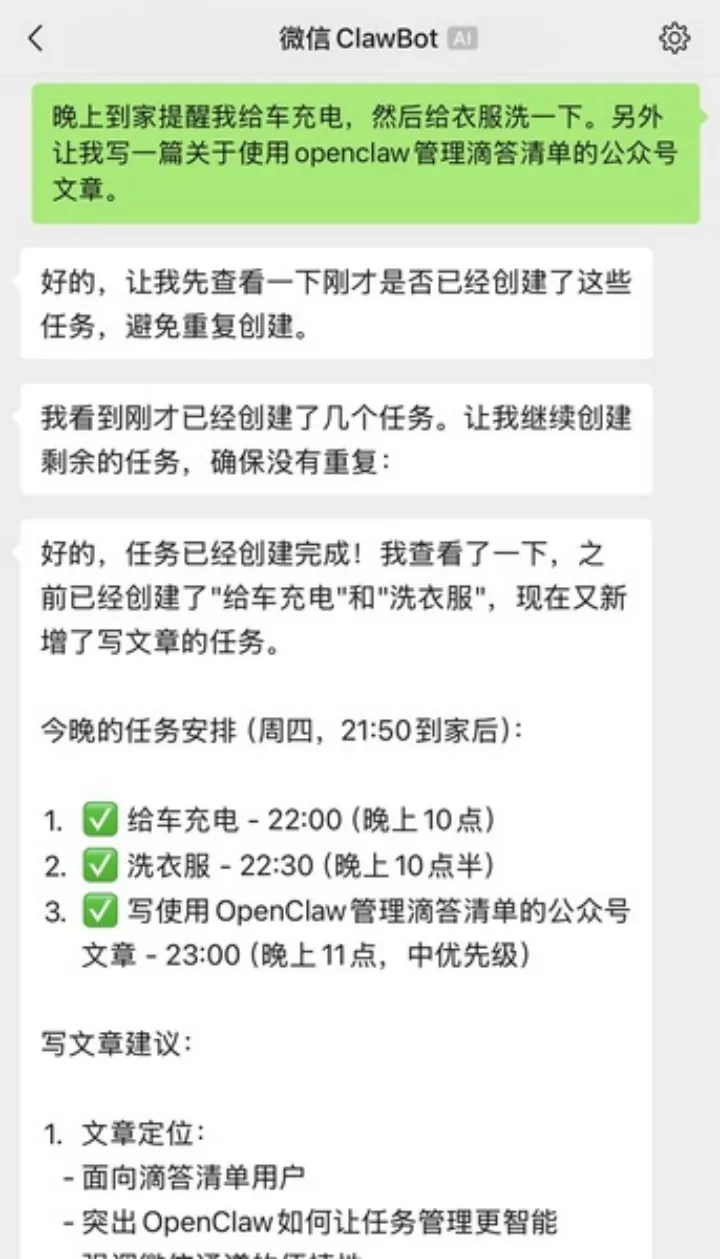 确保OpenClaw的微信通道已经开启,这样你就能直接在微信里用自然语言和OpenClaw交互,随时随地创建和调整任务,非常方便。