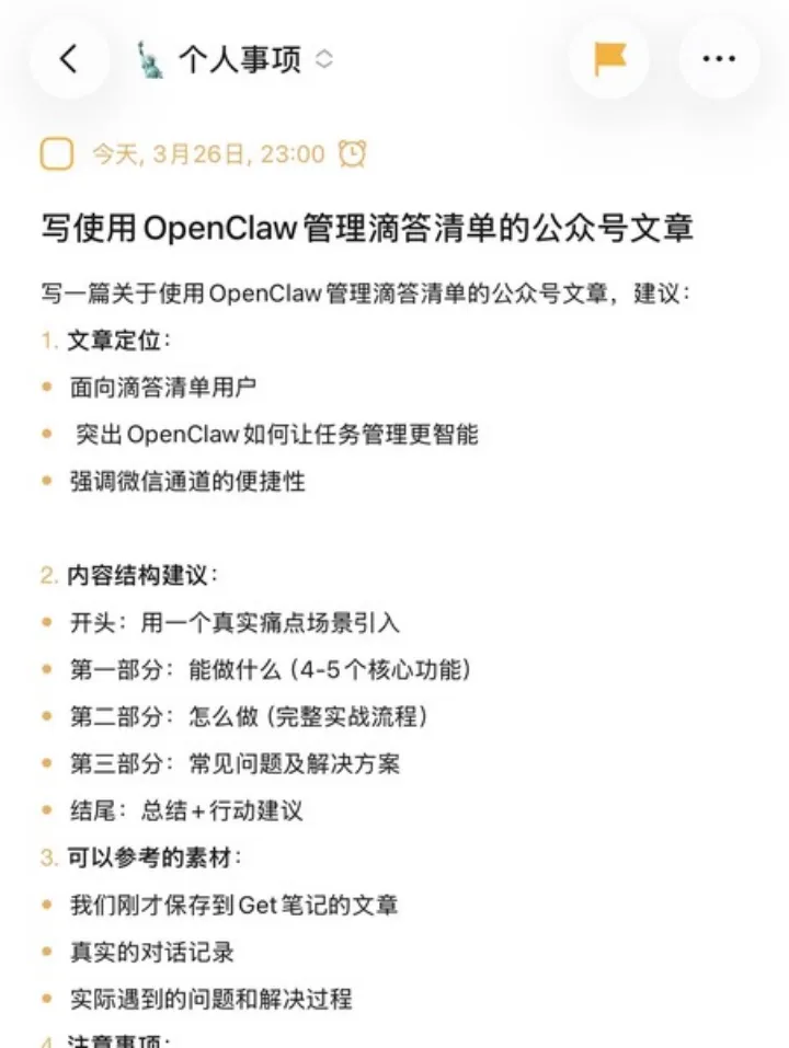 OpenClaw + 滴答清单的组合,让任务管理变得更智能、更高效,你只需要用自然语言说出你的需求,剩下的创建、分类、时间调整都可以交给AI来做,帮你节省大量时间。