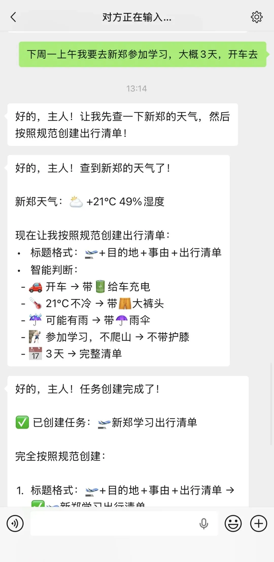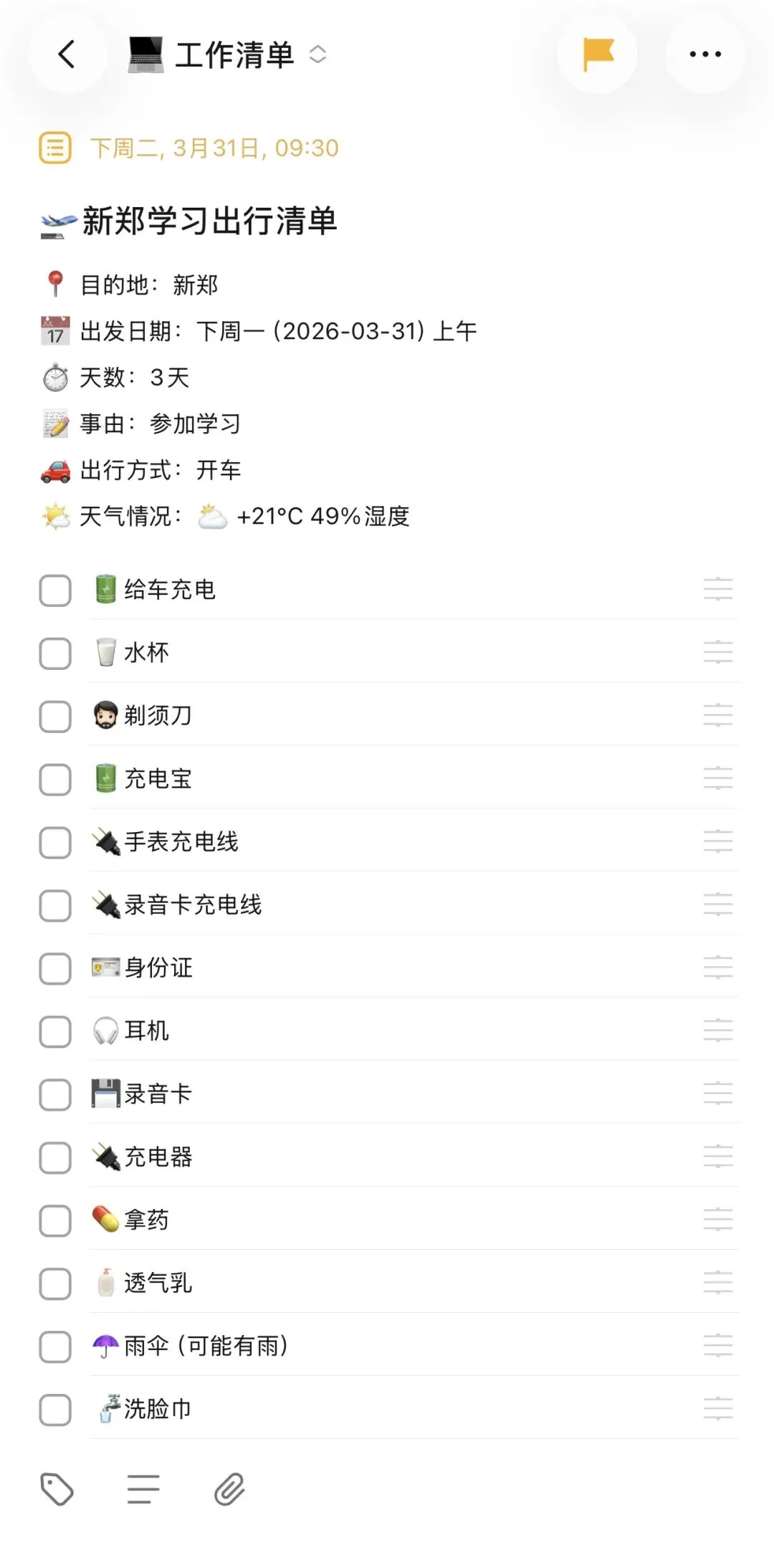 开封:☁️ +21°C 49% ↑13km/h```## 六、使用示例### 示例1:开封出差**用户说**:明天晚上6点去开封,开车,参加中恩培训课,4天**OpenClaw创建**:- 标题: 开封中恩培训课出行清单- 天气查询:☁️ +21°C- 智能判断: - 开车→ 带 给车充电 - 21°C不冷→ 带 大裤头 - 不爬山→ 不带护膝 - 可能有雨→ 带☂️雨伞### 示例2:北京旅游**用户说**:下周一去北京旅游,5天,坐高铁**OpenClaw创建**:- 标题: 北京旅游出行清单- 天气查询:先查北京天气- 智能判断: - 公共交通→ 提前3天买车票 - 根据天气选择衣物 - 不爬山→ 不带护膝## 七、快速开始1. 确保你的OpenClaw已安装weather技能2. 将此规范保存到你的MEMORY.md中3. 告诉你的OpenClaw:"以后所有出行都按这个规范创建清单"4. 开始使用!## 八、注意事项- 天气查询需要联网- 根据实际情况灵活调整清单- 可以根据个人习惯添加/删除清单项- 1天短途可以简化清单---**分享说明**:将此文档规范添加到自己的MEMORY.md中,就可以拥有同样的智能出行清单创建功能!