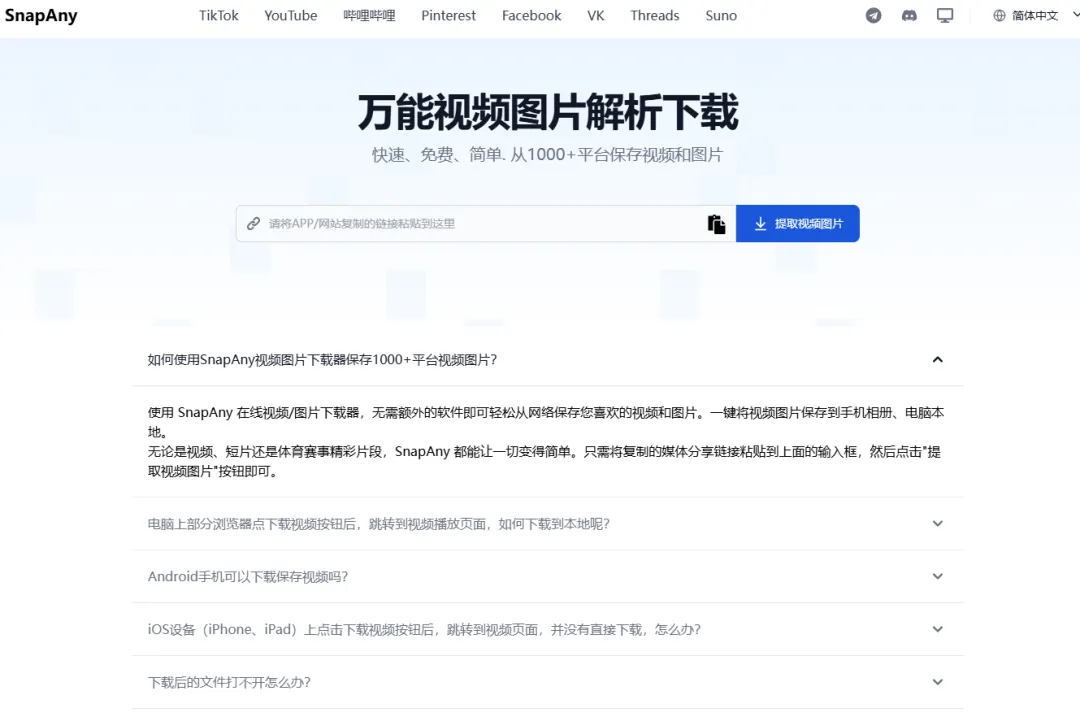 snapany.com/zh万能视频图片解析下载,支持抖音、油管、b站等1000+平台视频和图片免费下载,免费无限制。
