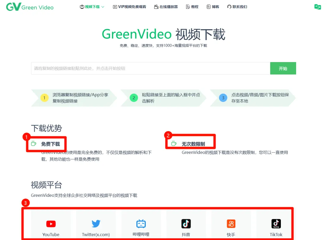 greenvideo.cc 支持1000+视频平台,包括微博,抖音,b站,快手,油管等,免费无限制。