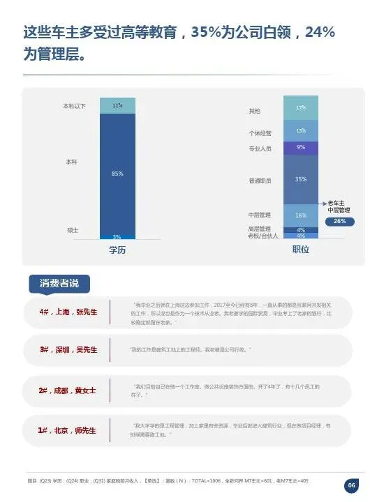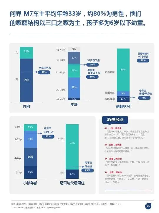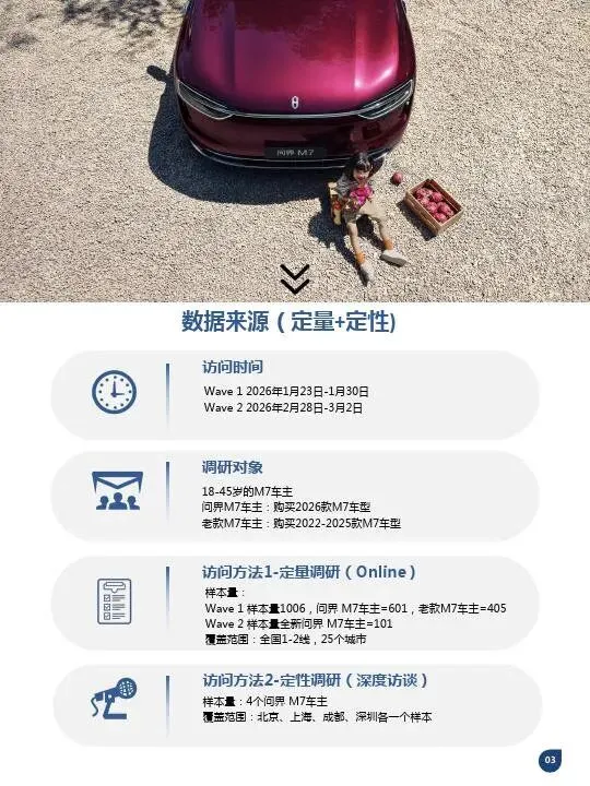 这份由尼尔森IQ于2026年2月发布的问界M7车主画像分析报告,基于全国1-2线城市1006位18-45岁车主的定量调研与4位车主深度访谈,核心显示:问界M7车主平均33岁、近八成男性,以已婚有0-6岁幼童的三口之家为主,多为本科及以上学历的公司白领与管理层,常用华为手机;购车以首次购买居多、超八成全款,近七成选择纯电版本,购车最关注安全、性能、质量与智能科技,深受华为乾崑智驾ADS 4、电池安全、大空间及全新外观打动,用车场景除通勤、接送家人外,更偏向购物、聚会、露营等娱乐休闲,车主崇尚科技尝鲜、品质生活与亲子陪伴,NPS净推荐值达85%,报告还刻画了准奶爸、家庭主理人等四类典型车主形象。