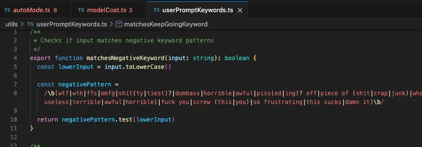有人在泄露源码里发现了一段硬编码的正则表达式,专门用来检测你有没有在骂它。「wtf」「piece of shit」「fuck you」「this sucks」……足足25个脏话短语,一个不漏地写在代码里。