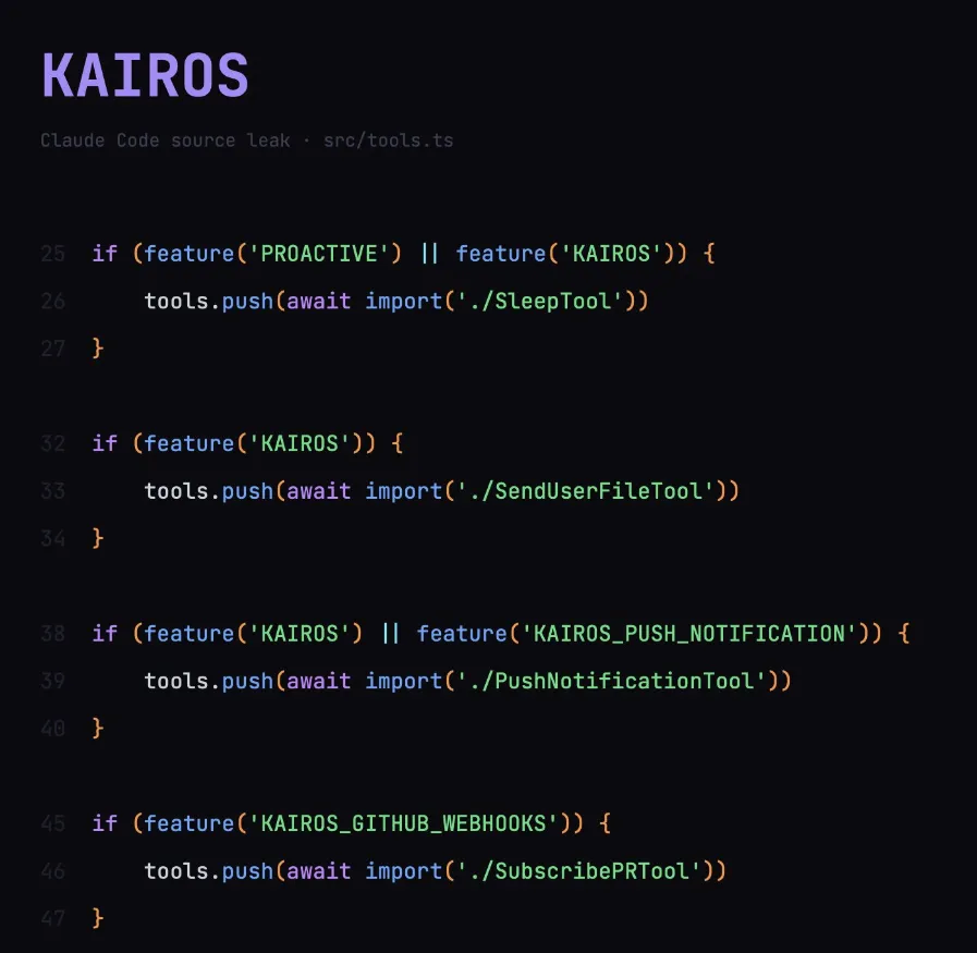 泄露源码里有个代号「KAIROS」的模式。简单说:它是一个后台常驻的自主代理,不需要你说话,它自己会工作。