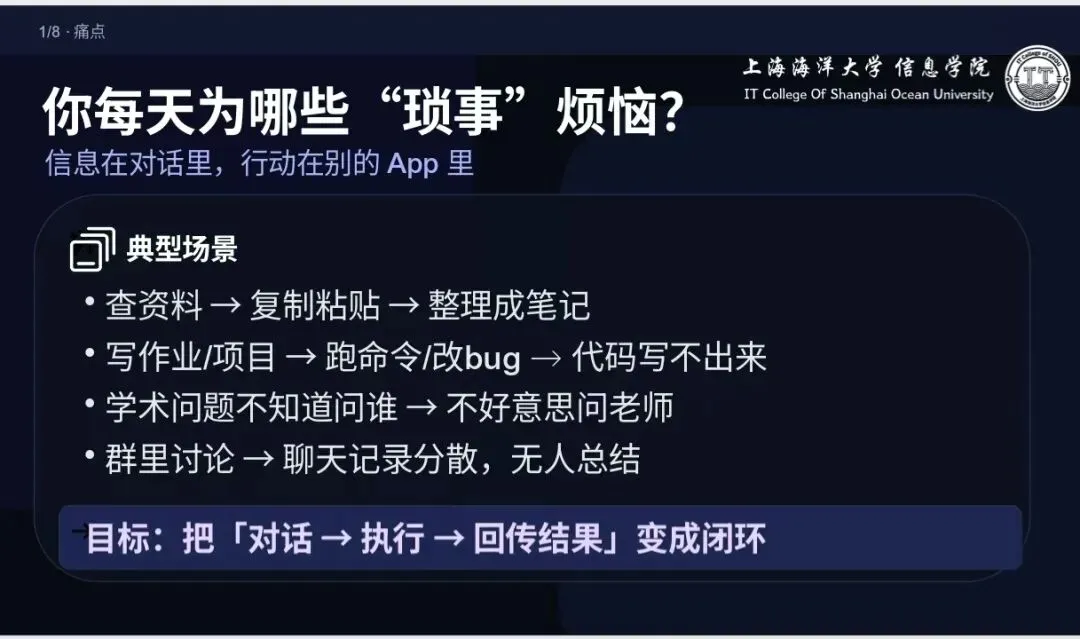 直击大学生查资料整理繁琐、代码开发遇阻、群聊信息分散等学习办公痛点,解决“信息在对话、行动在其他APP”的割裂问题。