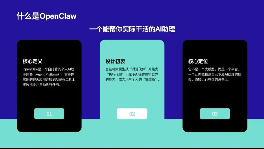 OpenClaw核心定位为能实际做事的AI个人助理,核心目标是打通「对话→执行→回传结果」完整闭环,核心能力涵盖工具调用、多渠道接入、自动化执行,核心价值并非聊天拟人,而是把事情完整做完。