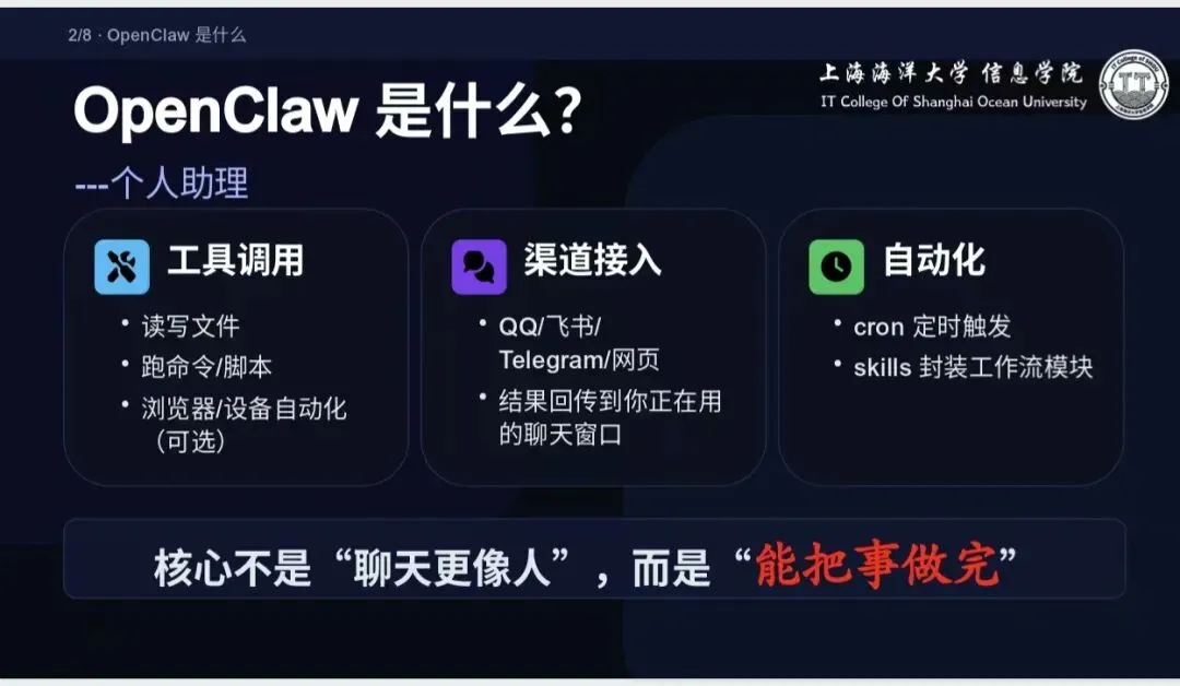 OpenClaw核心定位为能实际做事的AI个人助理,核心目标是打通「对话→执行→回传结果」完整闭环,核心能力涵盖工具调用、多渠道接入、自动化执行,核心价值并非聊天拟人,而是把事情完整做完。