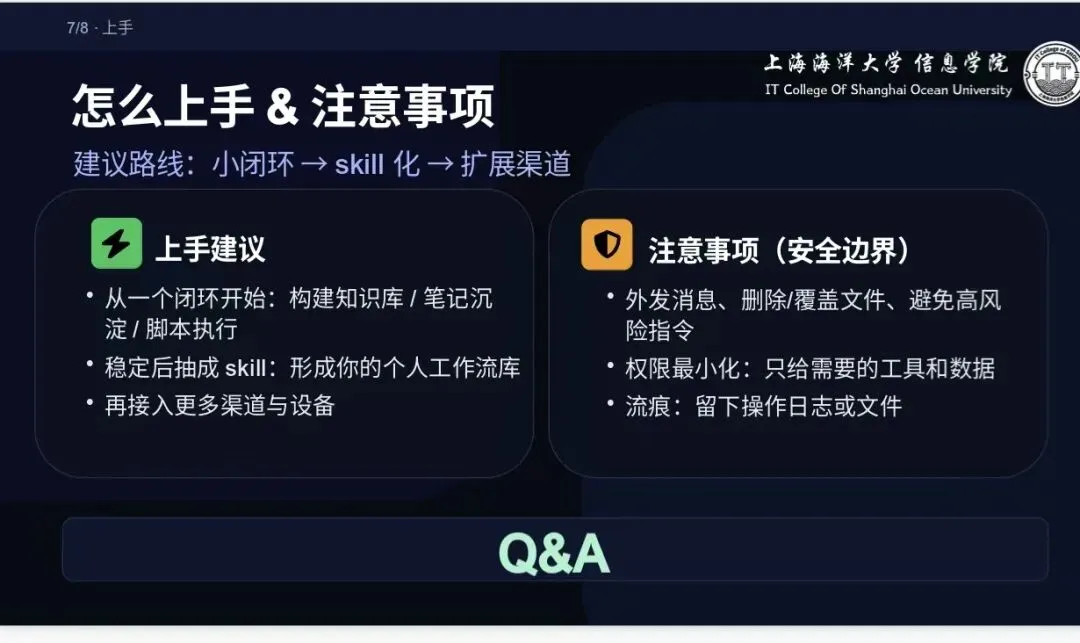 实操中实现自然语言指令→工具自动执行→结果回传聊天的极简闭环,全程无需人工介入;同时给出清晰上手路线「小闭环→skill化→扩展渠道」,并明确安全使用边界:权限最小化、规避高风险指令、保留操作痕迹,保障使用安全。