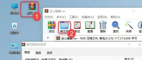 1.解压安装包:①双击【金山毒霸】压缩包②点击【解压到】③点击【确定】。