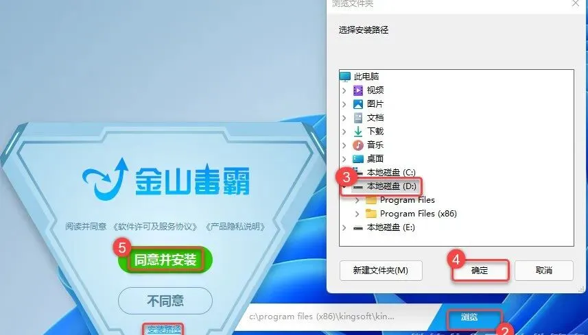 4.①点击【安装路径】②点击【浏览】③选择【需要安装的磁盘,如D盘】④点击【确定】⑤点击【同意并安装】。