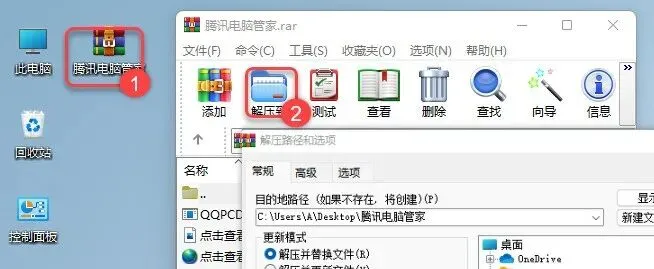 1.解压安装包:①双击【腾讯电脑管家】压缩包②点击【解压到】③点击【确定】。