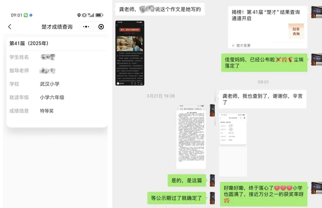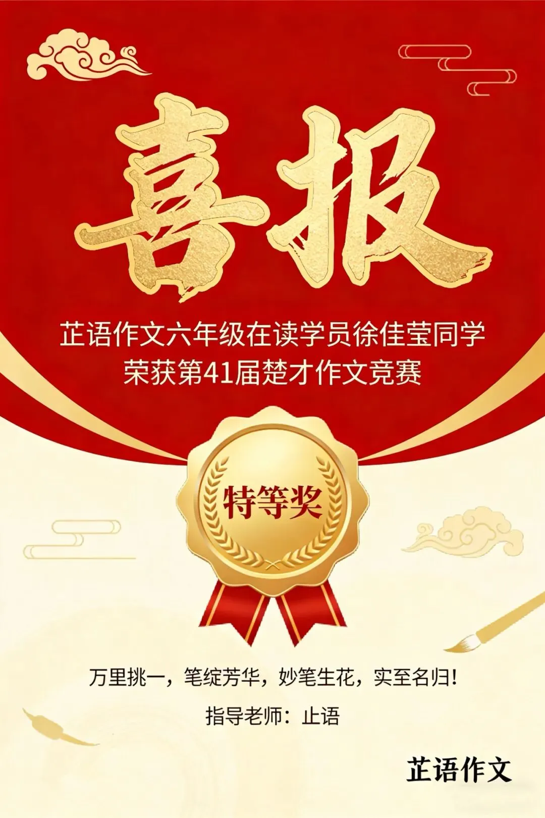 楚才竞赛作为全国知名的青少年作文赛事,素有“少年文学奥斯卡”之称,每年参赛人数超数万,特等奖名额更是万里挑一(获奖率约1/10000)。徐佳莹同学以细腻的笔触、深刻的立意,在众多优秀作品中突围,用实力书写属于自己的荣耀!