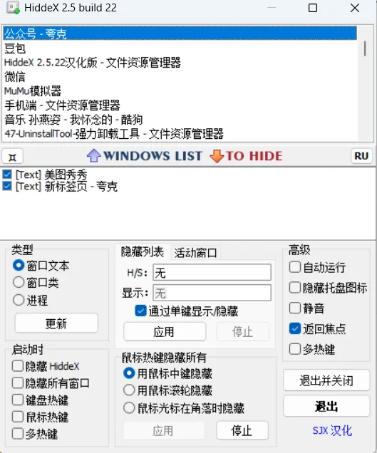 HiddeX 是一款轻量免费的电脑窗口隐藏工具,支持按窗口文本 / 类 / 进程筛选,可自定义热键 / 鼠标触发,无广告免安装,满足隐私保护、办公摸鱼等场景需求。
