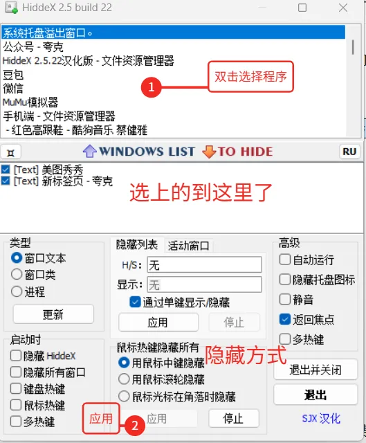 ②打开后,上方窗口,会读取当前运用的程序,双击需要快速隐藏的程序。(可多选)