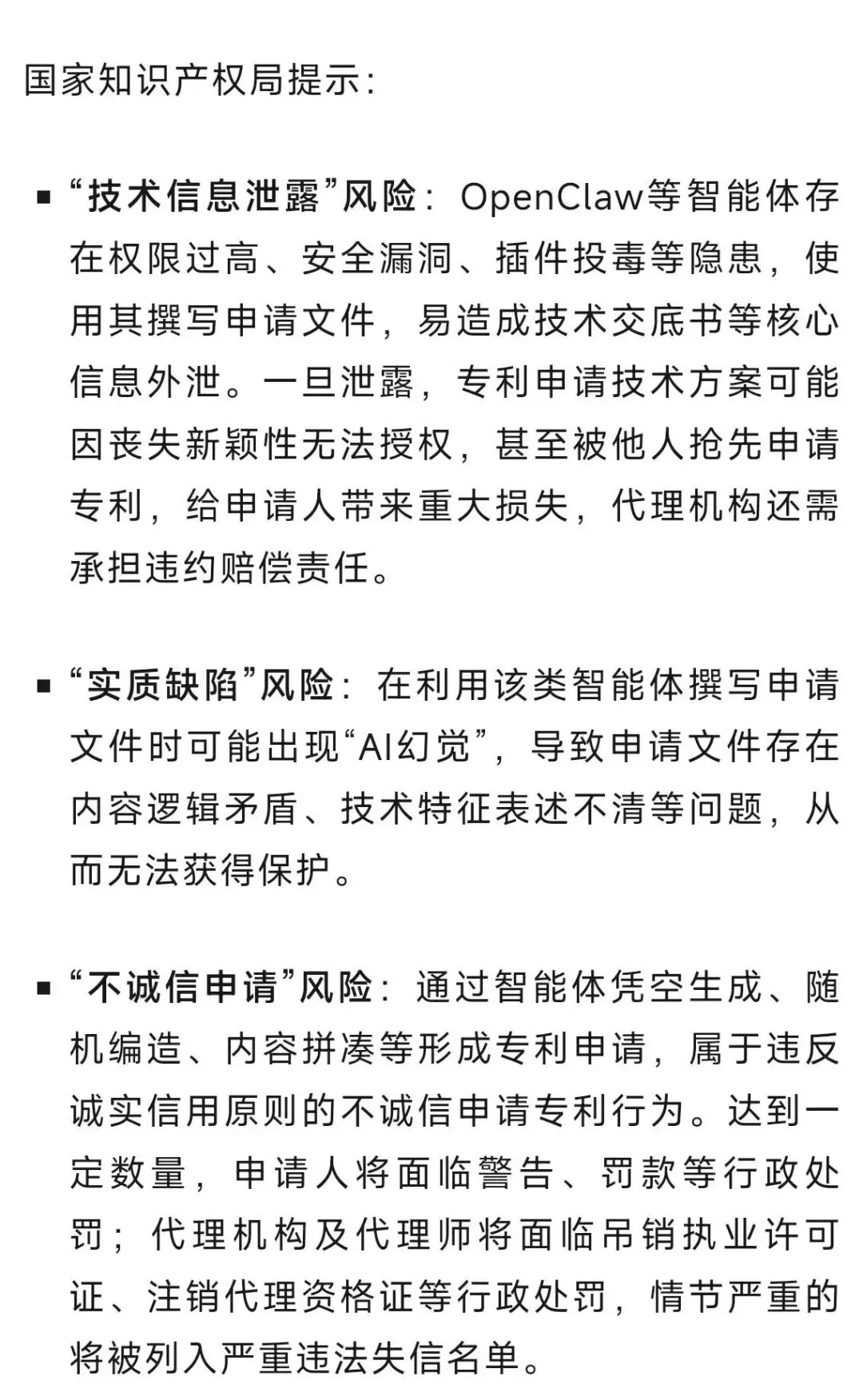 “龙虾”OpenClaw被曝安全配置脆弱,国家知识产权局发布风险提示国家知识产权局今天(1日)发布风险提示,OpenClaw(“小龙虾”,曾用名Clawdbot、Moltbot)等智能体工具被曝光默认安全配置脆弱,易引发严重安全风险,同时使用此类智能体撰写专利申请文件,也可能诱发多重风险。图片来源:视觉中国来源 | 央视新闻封面图来源 | 视觉中国编辑 | 邓旻璐初审 | 李红终审 | 孙柯官方报料邮箱 | 2281129650@qq.com推荐阅读重庆今日或有阵雨/雷雨!最高温直冲29℃,放晴时间来了→“今年蚊子史诗级加强🦟”,是真的吗?(附重庆4月健康风险提示)张雪机车爆单近期热门视频由于微信公众号平台改变了规则阅读后请点击“分享”“赞”并加星标这样才能及时收到第1眼TV-华龙网的推送点分享点收藏点点赞