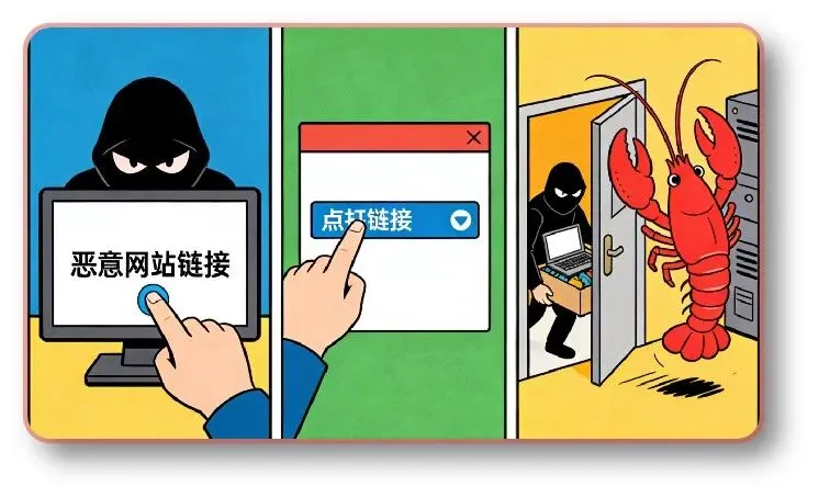 用户点击恶意链接 → 恶意脚本连接本地OpenClaw → 利用本地回环地址豁免机制,以每秒数百次速度暴力破解弱密码,1秒内即可攻破。