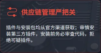 安装前务必审查插件源代码,发现可疑代码立即删除,不执行未知脚本。