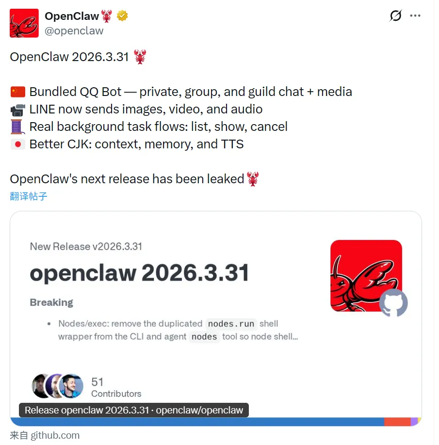 3 月 31 日,OpenClaw 官方在 X 上发布了 2026.3.31 更新公告,这条推文获得了 23.1 万次浏览、1481 个点赞,是近期官方帖子互动最高的一条。以下挑对国内用户最相关的几项介绍。