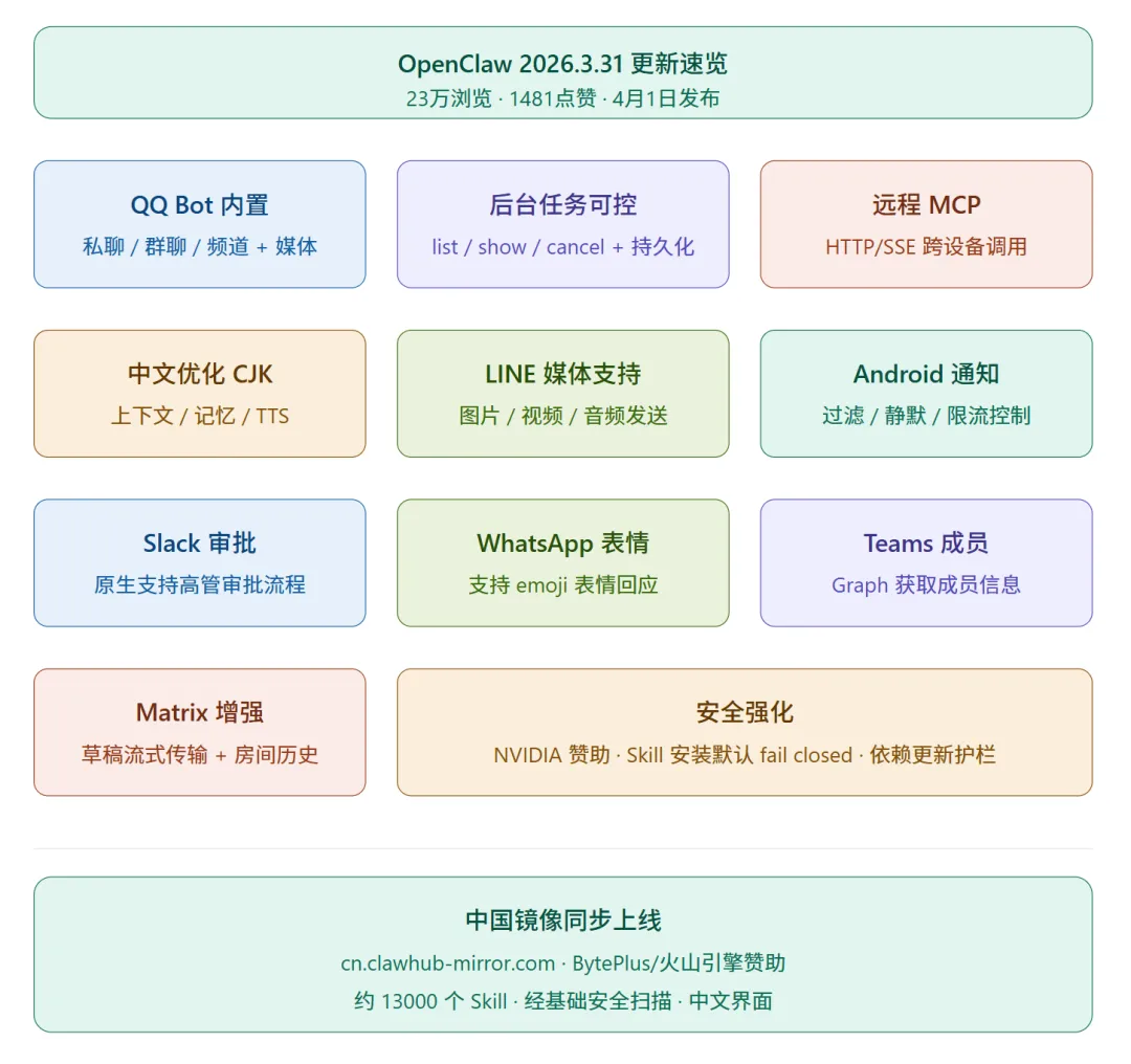 3 月 31 日到 4 月 1 日,OpenClaw 连续放了两个大动作:一个是功能更新幅度较大的 2026.3.31 版本,一个是面向国内用户的 ClawHub 中国镜像站。本文把两件事放在一起梳理,不夸大,说清楚。
