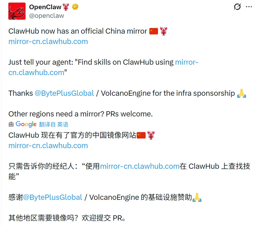 就在版本发布后,4 月 1 日官方宣布 ClawHub 中国镜像正式上线,由字节跳动旗下 BytePlus / 火山引擎提供服务器赞助。