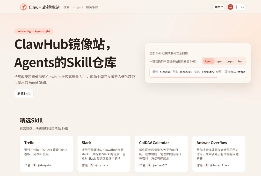 镜像站目前收录约 13000 个 Skill,提供中文界面,全部经过基础安全扫描。