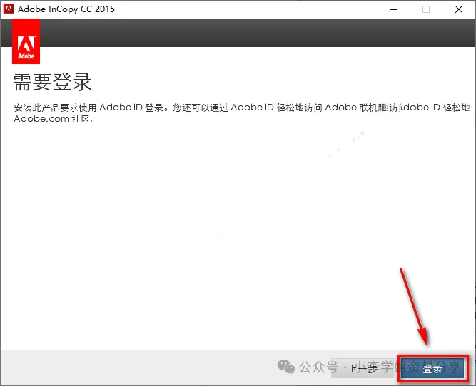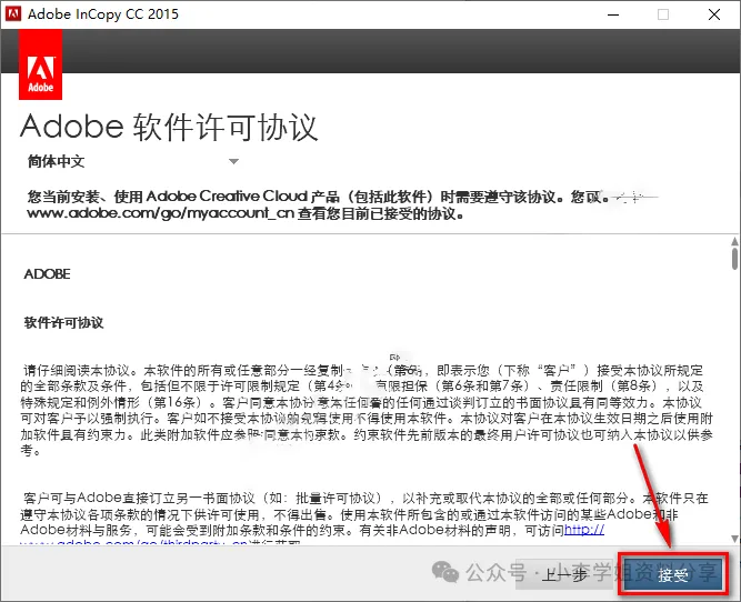6.点击“以后登录” ![]() 温馨提示:不断网也可以安装,但是需要登录Adobe账号。有账号登录,没有账号注册一个即可。 7.点击“接受” ![]() 8.选择软件安装路径,点击“安装”