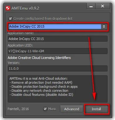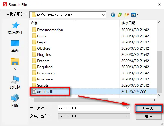 温馨提示:若打开没有破解工具,说明被电脑杀毒软件隔离了,关闭杀毒软件重新解压即可。 13.第一个选项卡选择Adobe InCopy CC 2015,点击“Install” ![]() 14.在弹出的文件资源管理器中,找到软件安装目录下的amtlib文件,点击“打开”。 默认路径为:C:\Program Files\Adobe\Adobe InCopy CC 2015