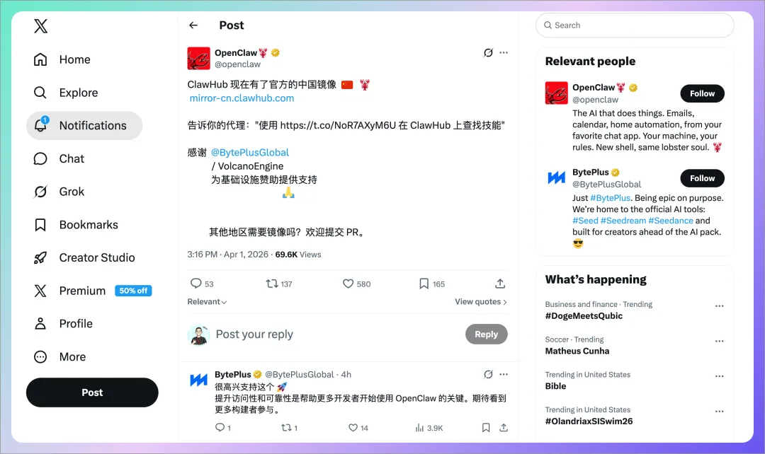 就在今天下午,OpenClaw 官方在 X 平台正式宣布:旗下技能市场 ClawHub 推出中国官方镜像站。