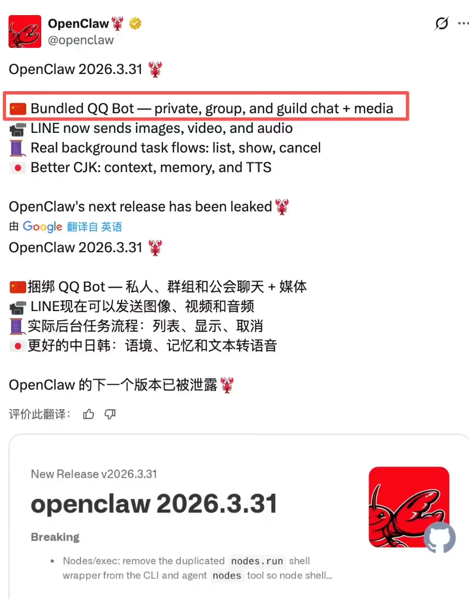 而OpenClaw发布的这个v2026.3.31版本,正是为了让大家提前打通社交闭环来的。