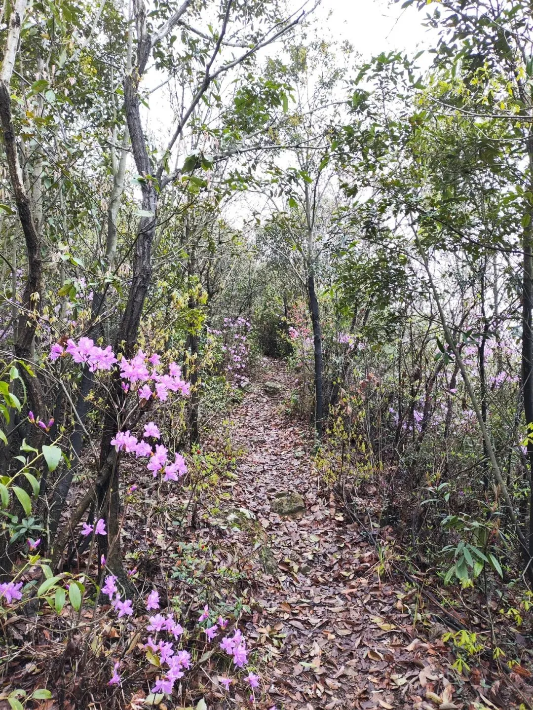 3.39公里处开始下山,画风瞬间变得温柔起来——小桥流水的田间石板路、蜿蜒曲折的乡村小道,农田、菜畦、水塘、小溪,随意拴在路边的小羊,一派生机勃勃的乡间景象,有“竹外桃花三两枝,春江水暖鸭先知”的惬意。经过一段短暂的木栈道后,会转入乡间公路,过马路时一定要仔细查看路况,岔路口也务必留意指示牌,别错过正确路线。