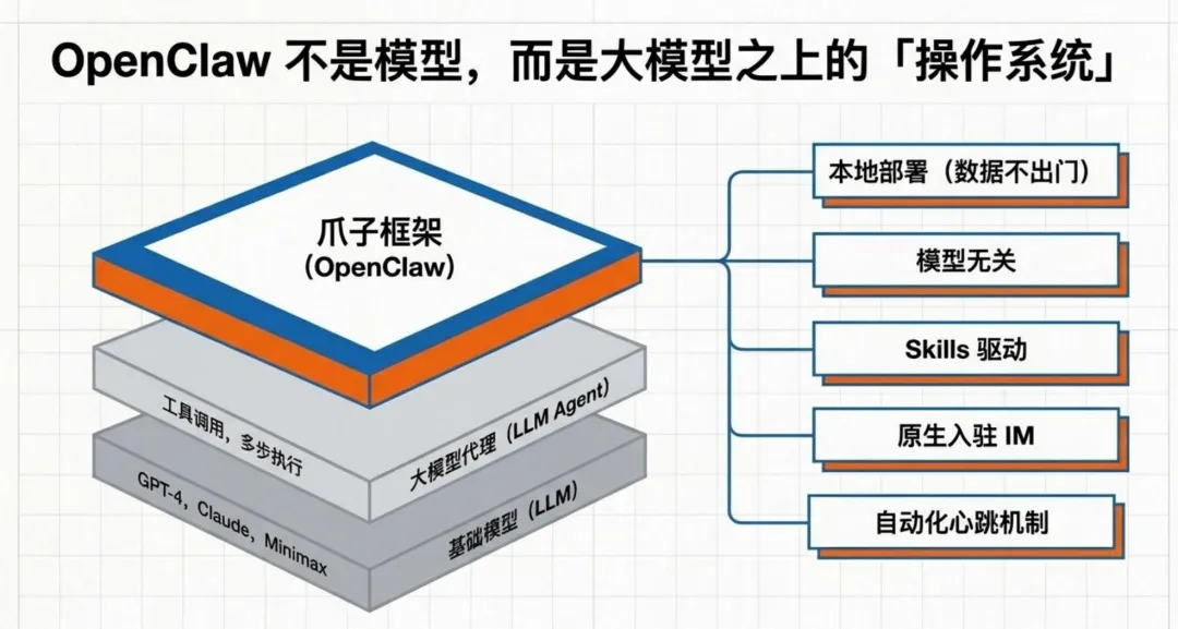 第三层是OpenClaw。这是小龙虾带来的东西。它不仅仅是一个Agent,而是跑在大模型之上的「操作系统」。它调度Agent、管理上下文、持久化运行。