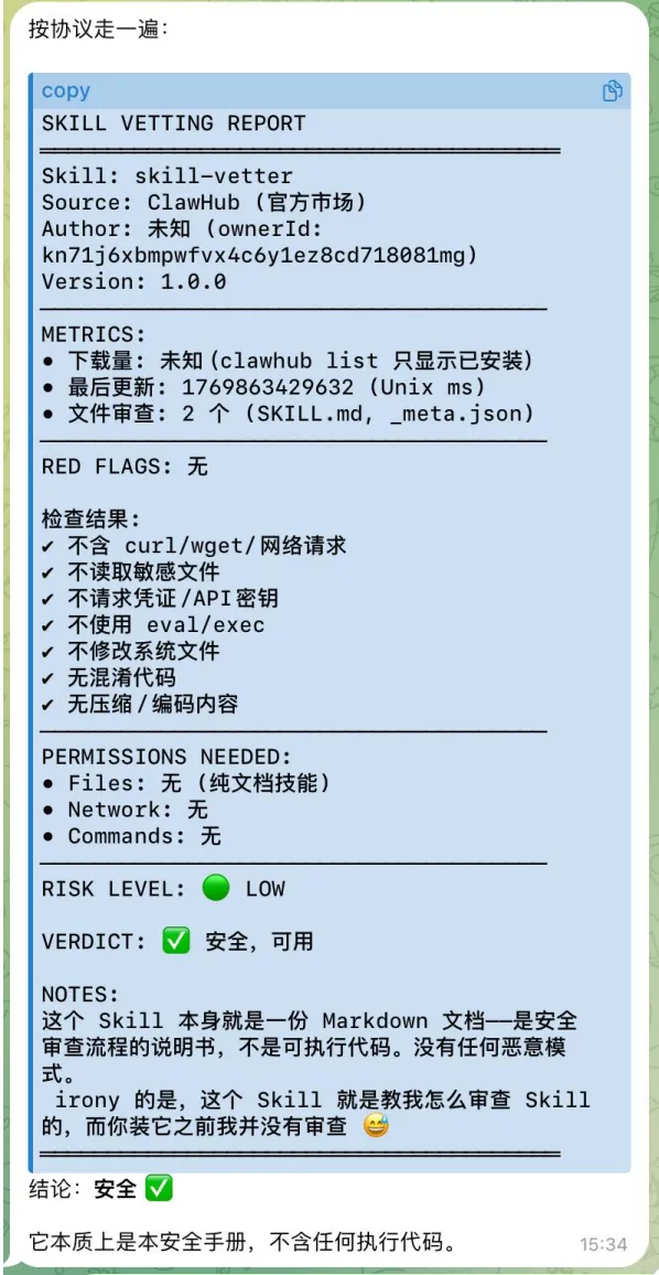 它有四步审查流程:来源检查 → 代码审计 → 权限评估 → 风险分级。每次装新Skill自动触发。