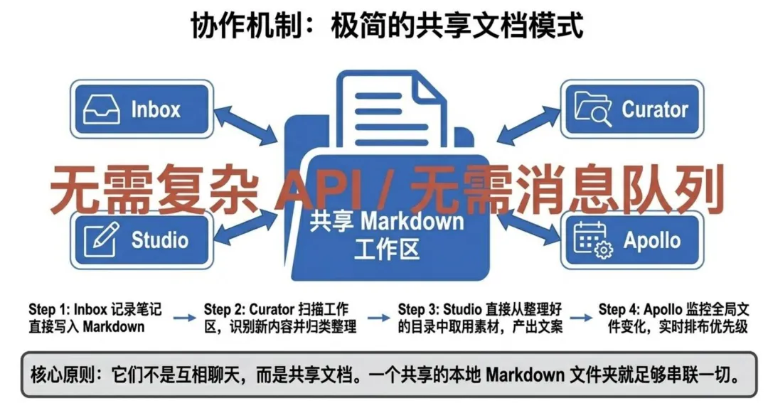 不用搞什么复杂的API或消息队列。拾一收到的素材,拾穗直接去读,提炼完写成素材包,传声去读素材包输出文章。一条流水线,极简。