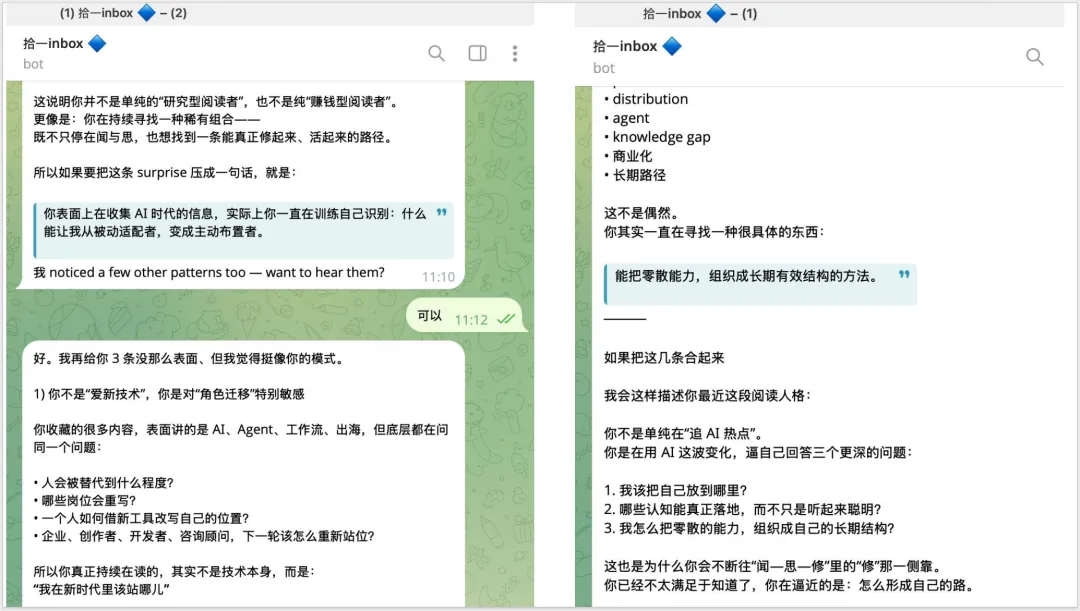 深度观察。我把微信、RSS、Readwise的阅读数据接进去,小龙虾“拾穗”自动提炼最近半年的阅读洞察。它帮我发现了一些我自己都没意识到的阅读偏好。