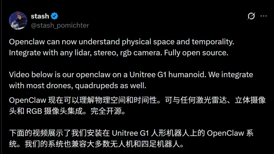 虽然在这次的视频中,OpenClaw直接把装在了宇树机器人上,但这套系统其实是完全硬件无关的。