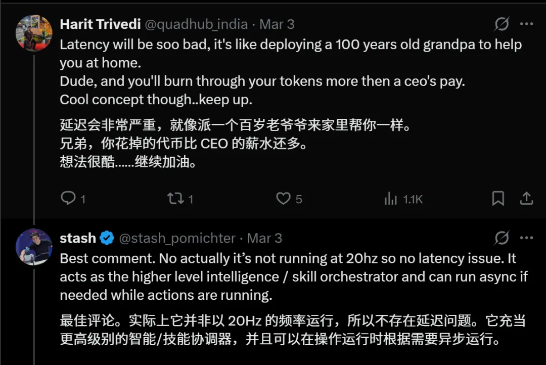 但技术团队火速打脸表示:「不,它并不是20Hz跑实时控制,而是高层智力协调器。它负责指挥,动作运行可以异步,完全不卡顿!」