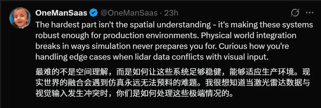 另外在评论区,一位机器人工程师说了一句非常真实的话:最难的不是空间理解,而是让系统在现实世界稳定运行。
