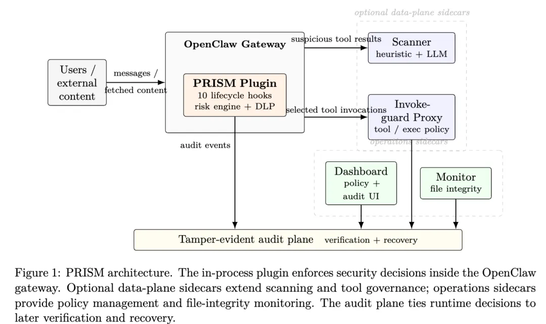 论文把这套方案命名为 PRISM,定位非常清楚:它是一层面向 OpenClaw 网关的运行时安全层,不追求改造基座模型,也不以“检测准确率第一”为目标,而是强调如何以较低侵入方式挂接到现有 Agent 网关之上,在运行过程中完成分阶段拦截、风险累积、策略执行、审计记录与恢复治理。