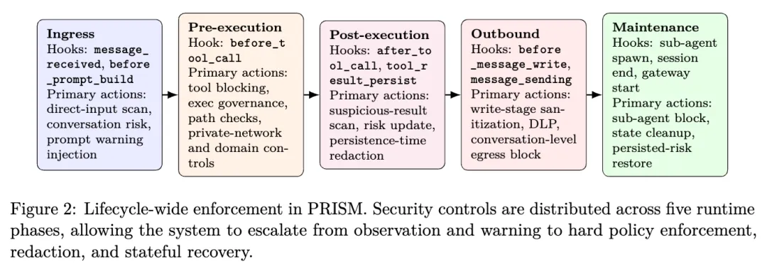 PRISM 最关键的设计,是把防护分散到整个智能体生命周期,而不是只在首尾各设一道关。论文把安全控制分布到了十个 lifecycle hooks 中,覆盖消息进入、prompt 构造、工具执行、工具结果持久化、对外消息发送、子智能体生成、会话结束以及网关启动等阶段。摘要和正文都反复强调这一点:它的目标不是在某一个点上做到百分之百识别,而是在整条运行链路上形成“层层递进”的防线。