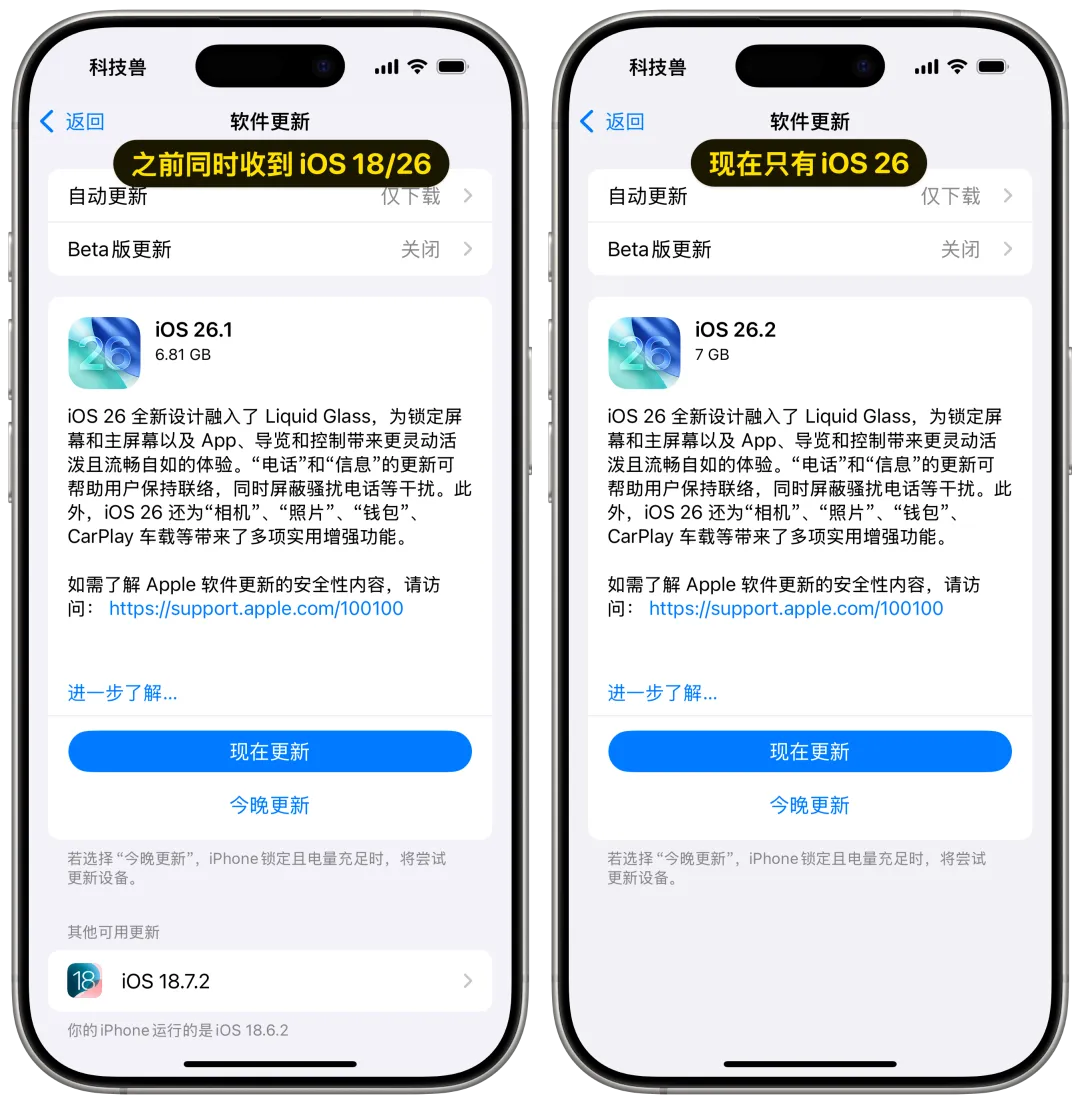 预计接下来 iOS 18 用户会在 iPhone「软件更新」里面,看到苹果推送的 iOS 18 / iOS 26 双版本。如果你的 iPhone 中有重要数据,同时又不打算升级到 iOS 26,那么选择升级 iOS 18 新版本就是个稳妥的选择。