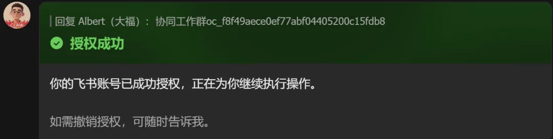 当我尝试让 OpenClaw 读取我的飞书多维表格时,系统自动推送了授权卡片——我只需要点一下「确认」,无需手动复制 Token,无需配置任何东西。