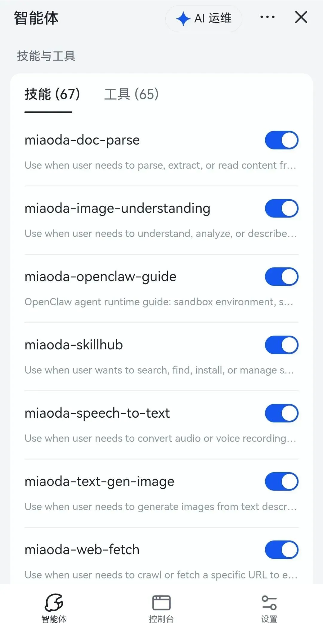 飞书 OpenClaw 内置了67项技能和65种工具,涵盖了: